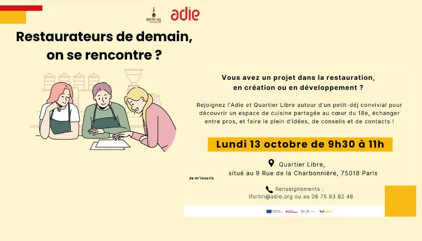 Porteurs de projet dans le secteur de la restauration? Venez rencontrer l’ADIE et l’équipe de Quartier Libre autour d’un petit déjeuner convivial. Visite, échanges, conseils.
